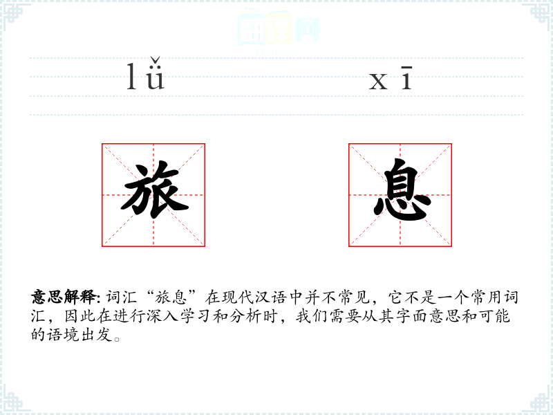 词汇“旅息”在现代汉语中并不常见,它不是一个常用词汇,因此在进行深入学*和分析时,我们需要从其字面意思和可能的语境出发。