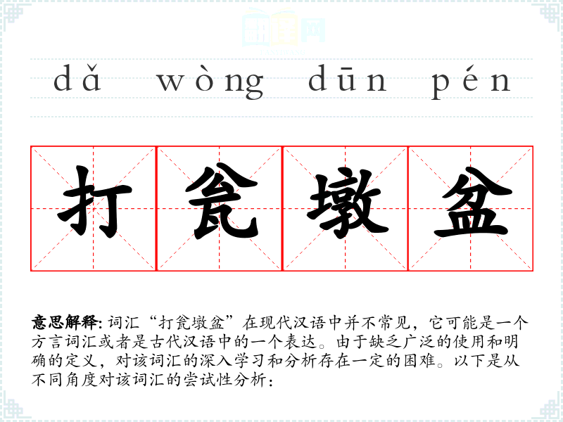 由于“打瓮墩盆”不是一个标准汉语词汇,其字面意思和基本含义难以确定。从字面上看,“打”可能意味着敲打或制作,“瓮”是一种陶制的容器,“墩”可能指的是堆砌或堆积,“盆”是一种容器。结合起来,这个词汇可能指的是制作或处理陶器的过程。
