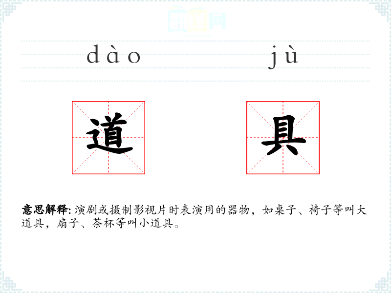 演剧或摄制影视片时表演用的器物,如桌子、椅子等叫大道具,扇子、茶杯等叫小道具。
