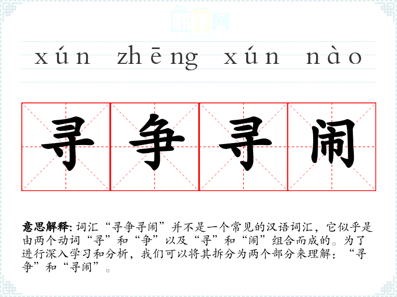词汇“寻争寻闹”并不是一个常见的汉语词汇,它似乎是由两个动词“寻”和“争”以及“寻”和“闹”组合而成的。为了进行深入学习和分析,我们可以将其拆分为两个部分来理解:“寻争”和“寻闹”。