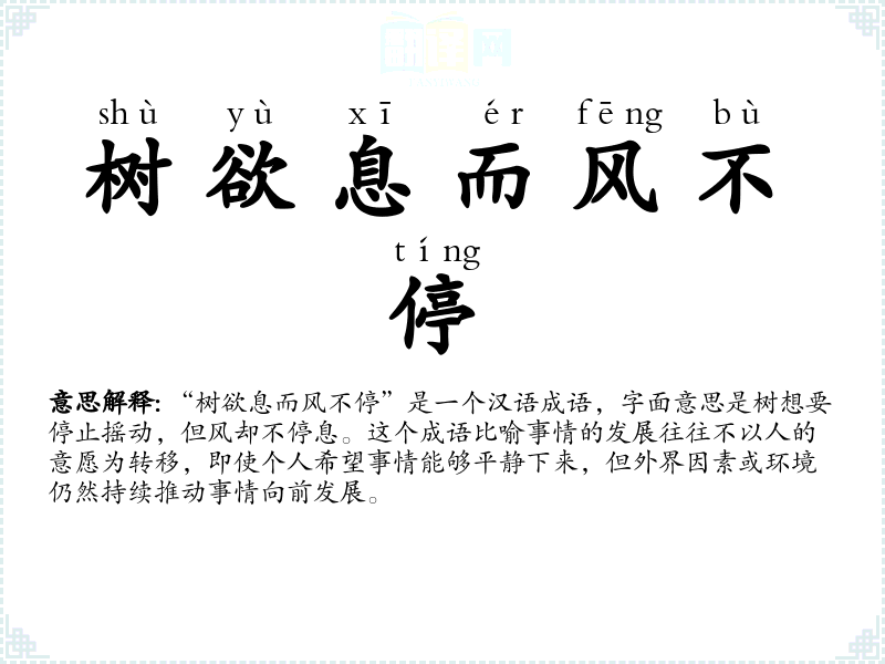 “树欲息而风不停”是一个汉语成语,字面意思是树想要停止摇动,但风却不停息。这个成语比喻事情的发展往往不以人的意愿为转移,即使个人希望事情能够平静下来,但外界因素或环境仍然持续推动事情向前发展。