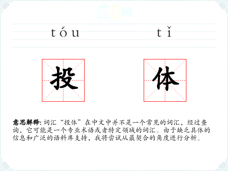 词汇“投体”在中文中并不是一个常见的词汇,经过查询,它可能是一个专业术语或者特定领域的词汇。由于缺乏具体的信息和广泛的语料库支持,我将尝试从最契合的角度进行分析。