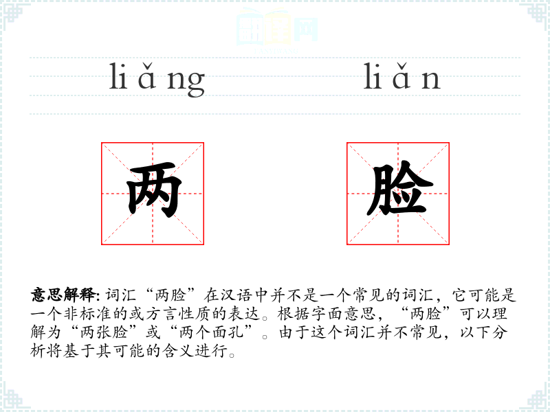 词汇“两脸”在汉语中并不是一个常见的词汇,它可能是一个非标准的或方言性质的表达。根据字面意思,“两脸”可以理解为“两张脸”或“两个面孔”。由于这个词汇并不常见,以下分析将基于其可能的含义进行。