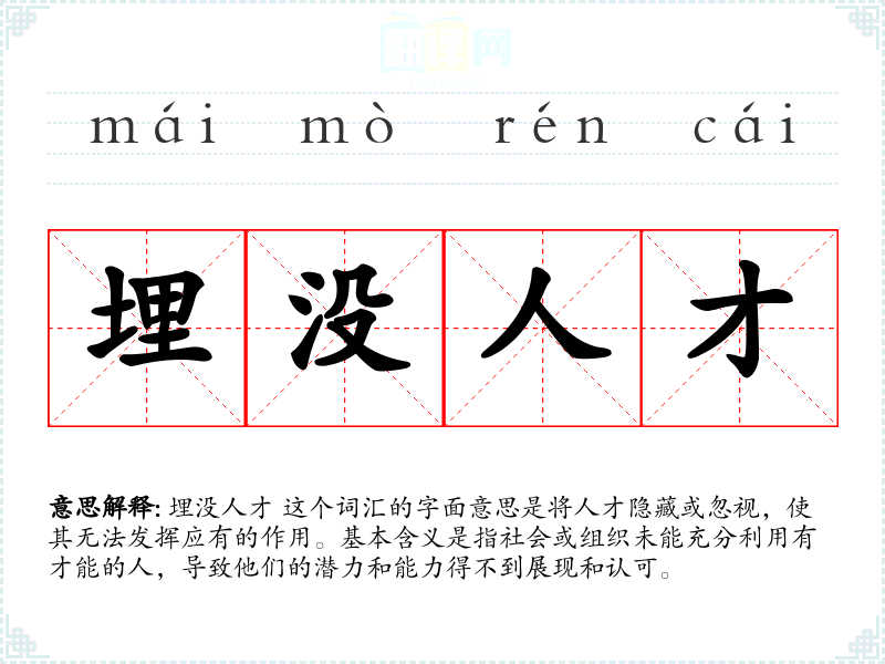 埋没人才 这个词汇的字面意思是将人才隐藏或忽视,使其无法发挥应有的作用。基本含义是指社会或组织未能充分利用有才能的人,导致他们的潜力和能力得不到展现和认可。