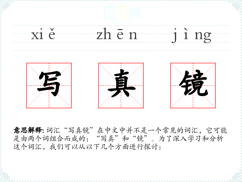 词汇“写真镜”在中文中并不是一个常见的词汇,它可能是由两个词组合而成的:“写真”和“镜”。为了深入学习和分析这个词汇,我们可以从以下几个方面进行探讨:
