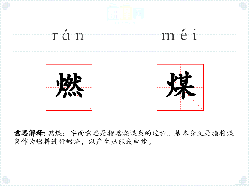 燃煤:字面意思是指燃烧煤炭的过程。基本含义是指将煤炭作为燃料进行燃烧,以产生热能或电能。