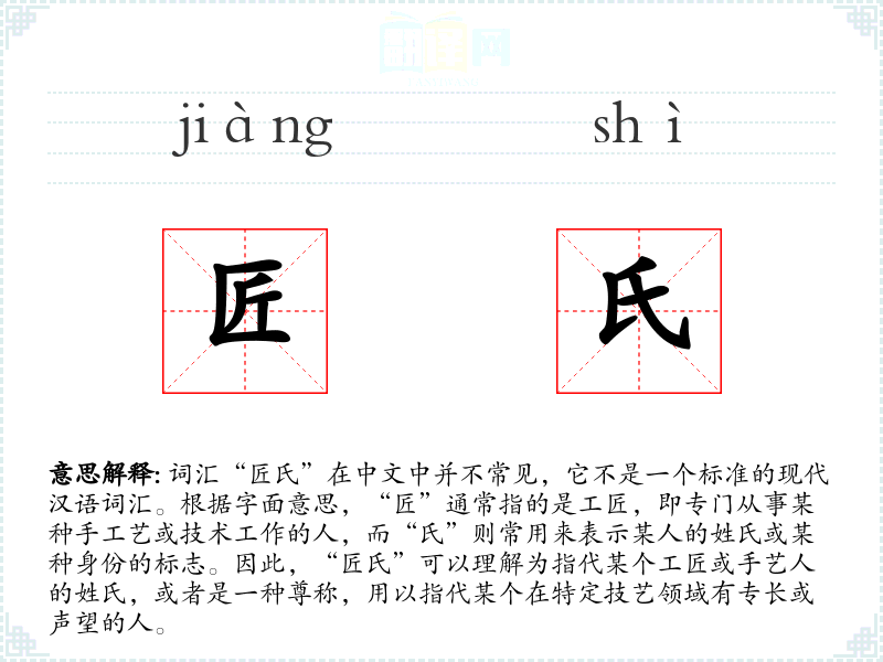 词汇“匠氏”在中文中并不常见,它不是一个标准的现代汉语词汇。根据字面意思,“匠”通常指的是工匠,即专门从事某种手工艺或技术工作的人,而“氏”则常用来表示某人的姓氏或某种身份的标志。因此,“匠氏”可以理解为指代某个工匠或手艺人的姓氏,或者是一种尊称,用以指代某个在特定技艺领域有专长或声望的人。