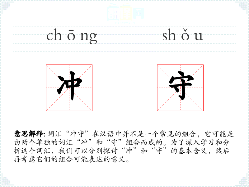 词汇“冲守”在汉语中并不是一个常见的组合,它可能是由两个单独的词汇“冲”和“守”组合而成的。为了深入学*和分析这个词汇,我们可以分别探讨“冲”和“守”的基本含义,然后再考虑它们的组合可能表达的意义。