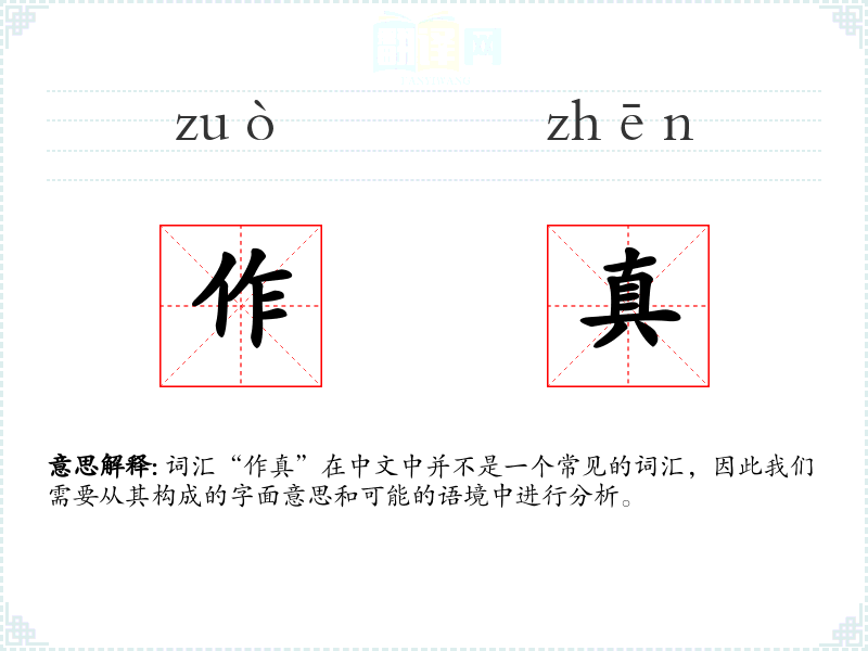 词汇“作真”在中文中并不是一个常见的词汇,因此我们需要从其构成的字面意思和可能的语境中进行分析。
